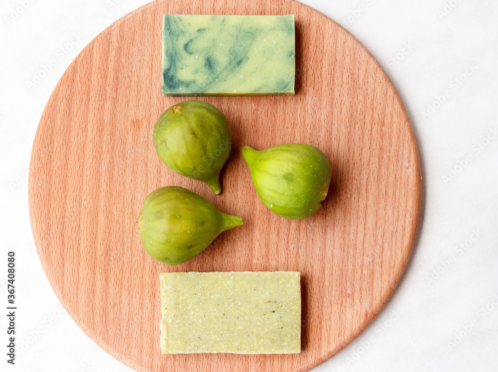 Natural green soap with Fig extract and fruit on a wooden round Board