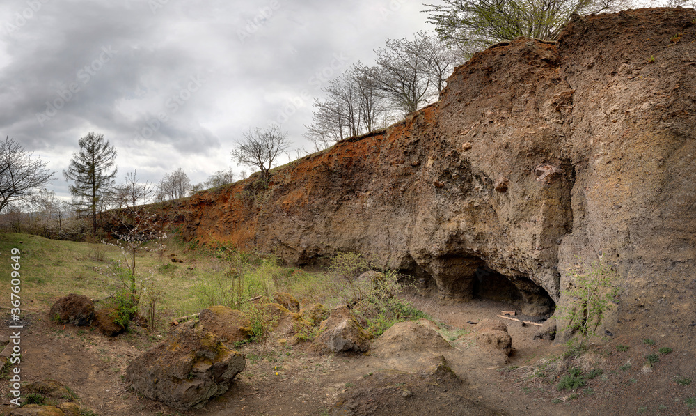 Extinct volcano Uhlirsky vrch, Czech Republic - view of the quarry where volcanic ash (tuff) was mined. The volcano was active 1.7 million years ago