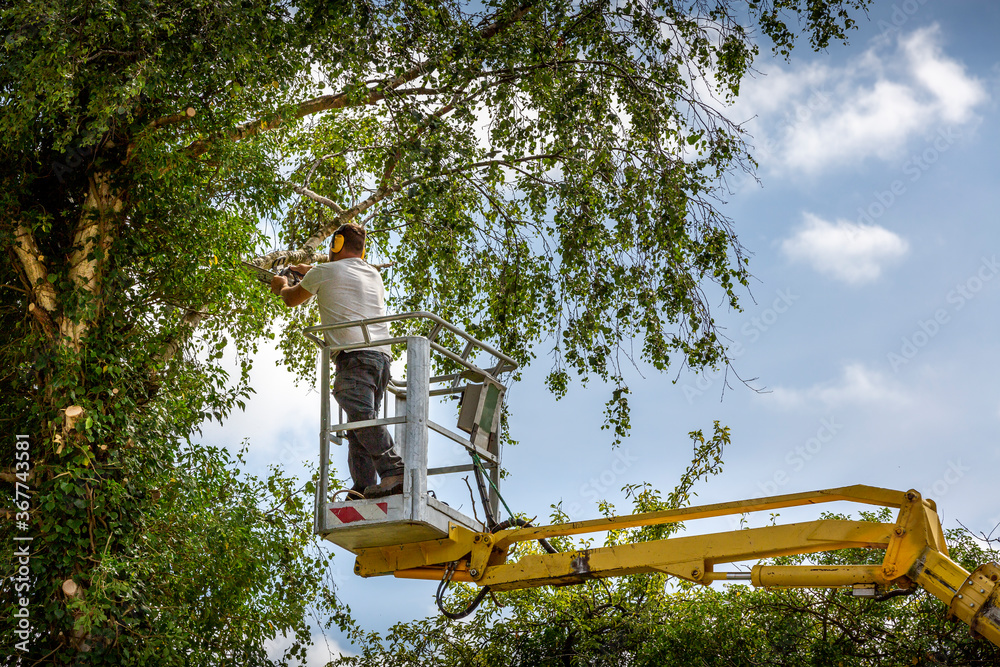 Unidentified arborist man in the air on yellow elevator, basket with controls, cutting off dead cherry tree