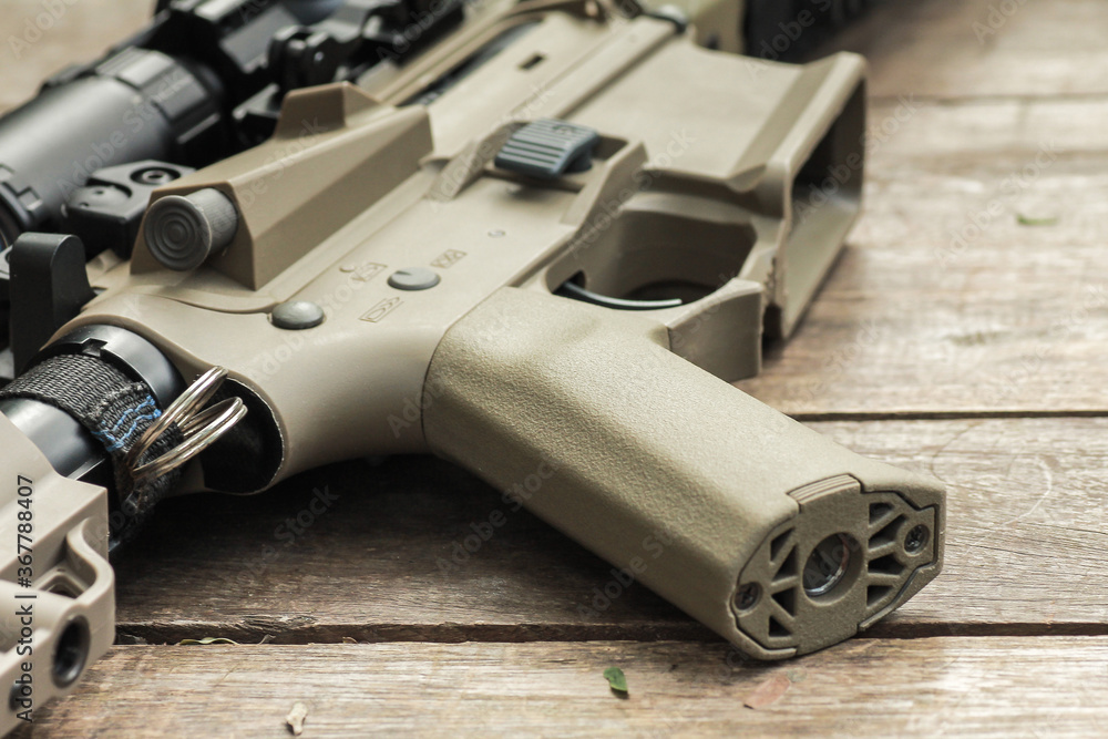 Military AR15 automatic assault rifle weapon with aim sight and flashlight