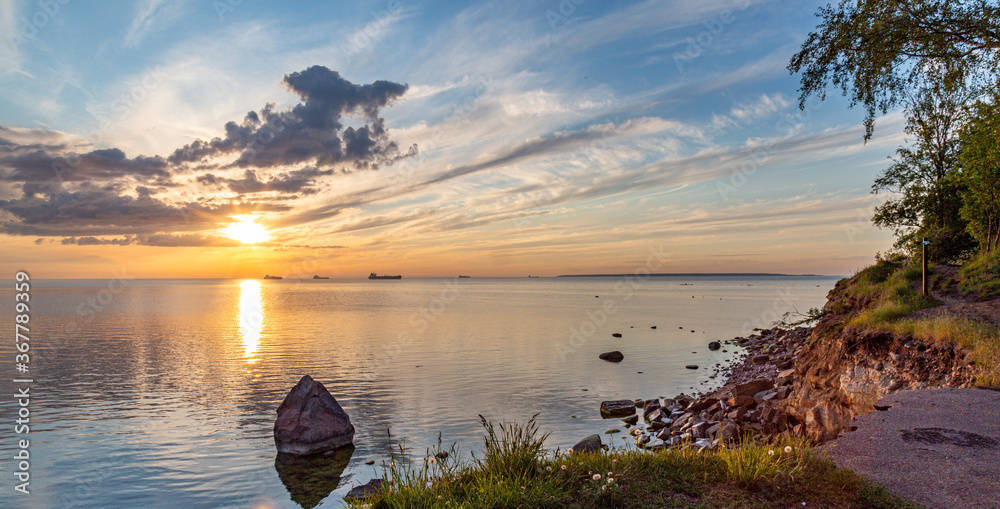 Silhouette of ships on background out at sea at cloudy sunset