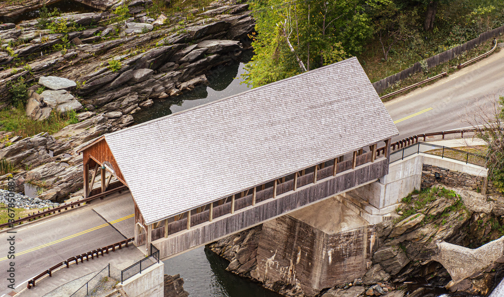 aerial view of the Quechee Covered Bridge, over the Ottauquechee River, Quechee Vermont
