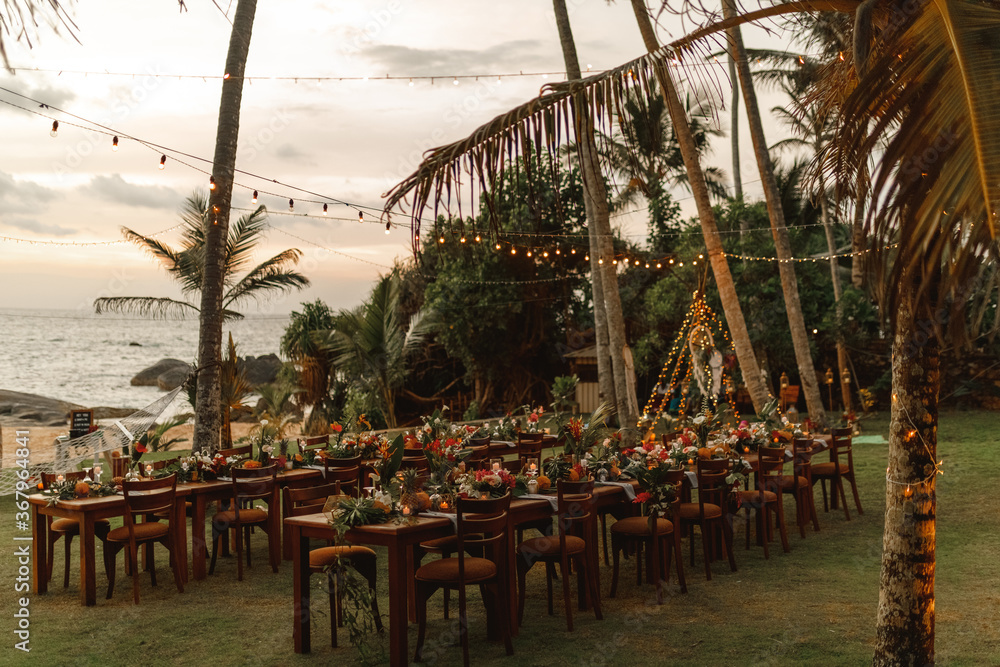 Set tables for a wedding dinner in a tropical garden. Concept of tropical beach wedding. Romantic sunset light