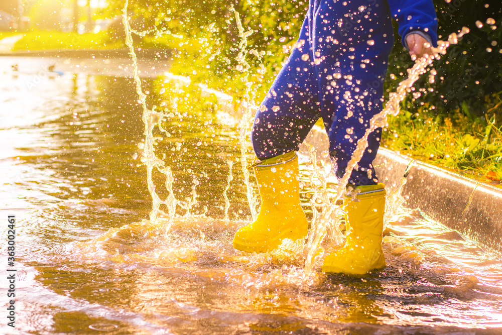 My rubber-booted feet are Bouncing in a puddle. Article about rubber boots. Children's summer shoes. Puddles after rain. Bad weather. A child jumps in a puddle. Happy childhood. A happy boy in rubber