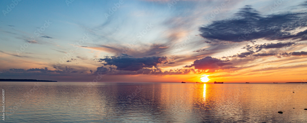 Silhouette of ships on background out at sea at beautiful sunset