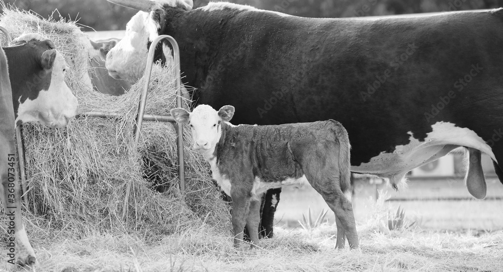 Hereford calf with bull and beef cow herd on farm in black and white, eating hay out of feeder.