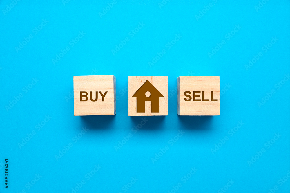Wooden cubes with the words BUY, SELL and the drawing of a house