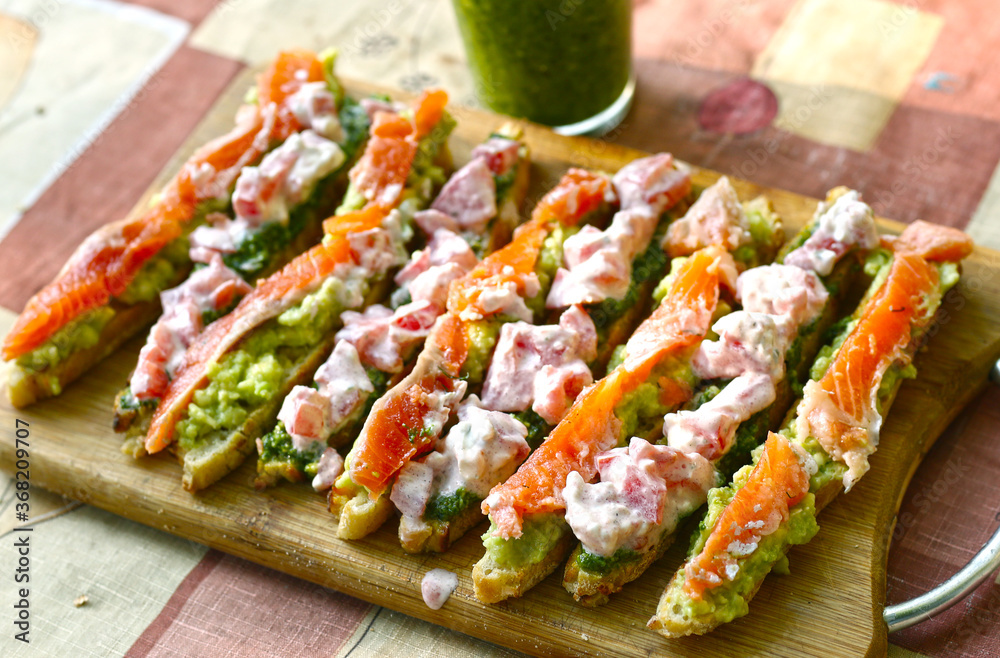 italian cuisine bruschetta with pesto and salmon with cream cheese and garlic
