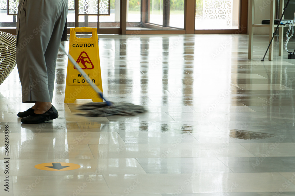 Mopping wet floor in lobby hotel. Background for caution wet floor.