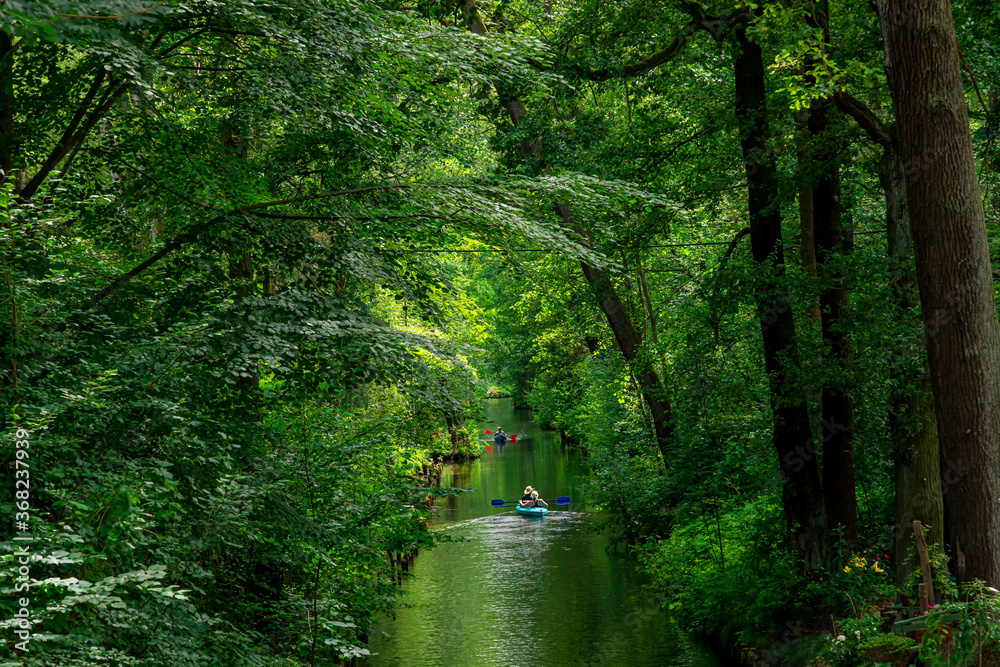 Urlauber fahren Kajak auf einem Kanal im Spreewald