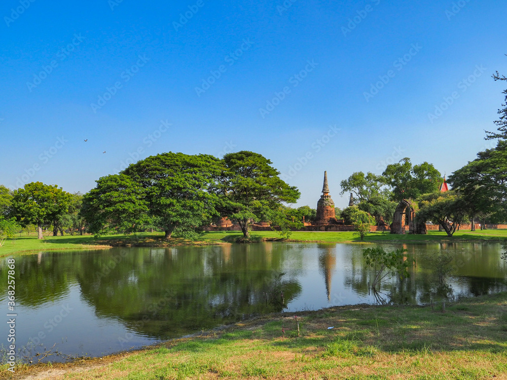 タイ、アユタヤの王宮跡の仏塔と池の水面のリフレクションと緑の木々 / Pagoda of The Grand Palace in Ayutthaya with reflection on pond and green trees at Ayutthaya, Thailand