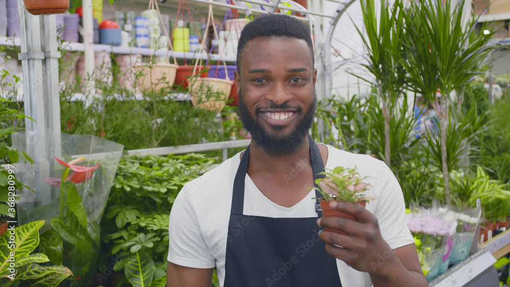 Portrait of young african man owner of garden center or flower shop with small pot plant