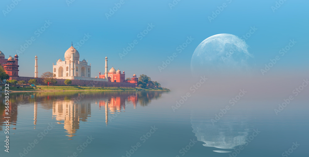 Taj Mahal with full moon at sunset - Agra, India "Elements of this image furnished by NASA"