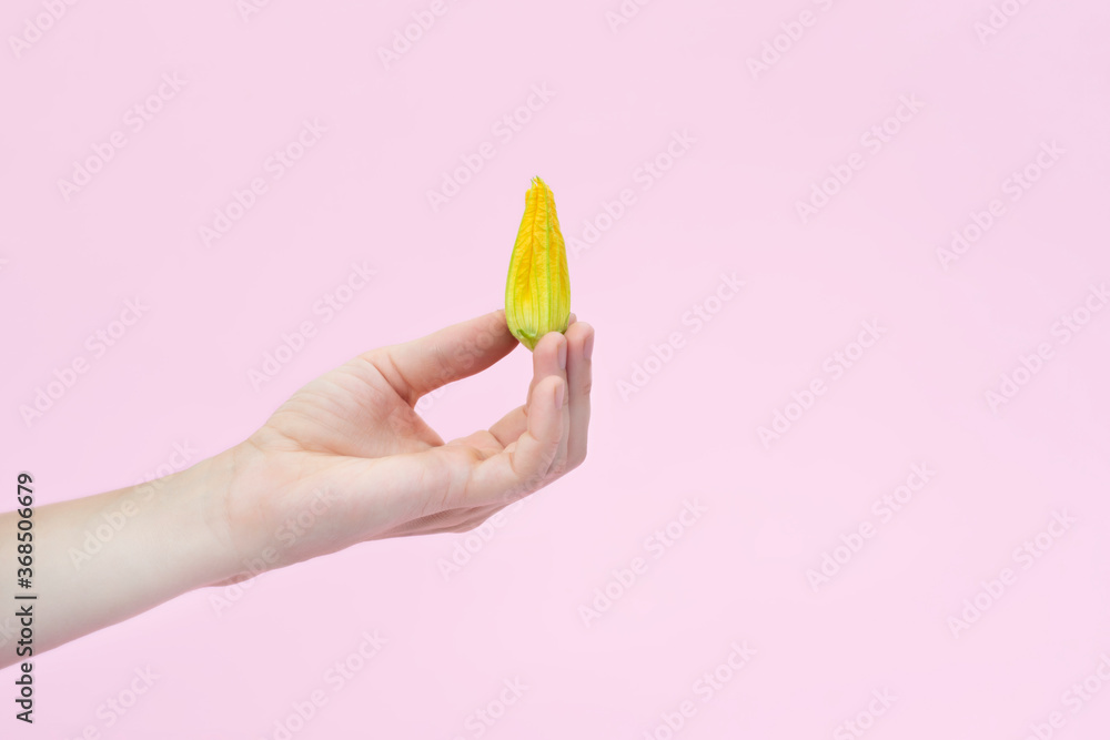 Yellow pumpkin or zucchini flowers in female hand isolated on pink background.