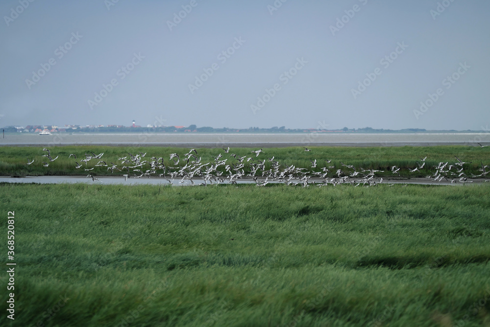 Mövenschwarm im Nationalpark Niedersächsisches Wattenmeer bei Harlesiel an der Nordseeküste und Deichvorland mit Schilf und Priel sowie der Insel Wangerooge im Hintergrund - Stockfoto