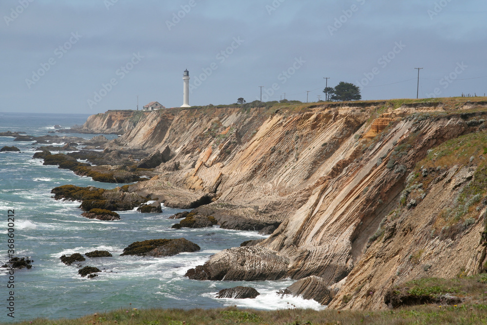 The Pacific coastline north of San Fransisco with Point Arena lighthouse in the distance, California, USA