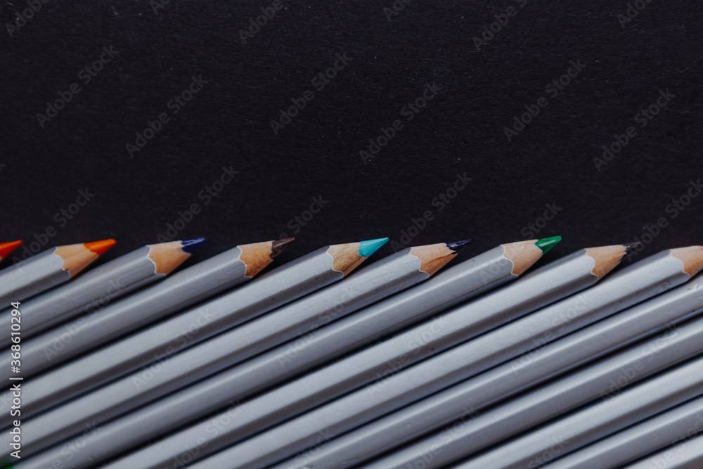 dark creative artistic background with sharpened colored pencils. Background for art workshops, artists' workshops, picture galleries, art schools or social advertising