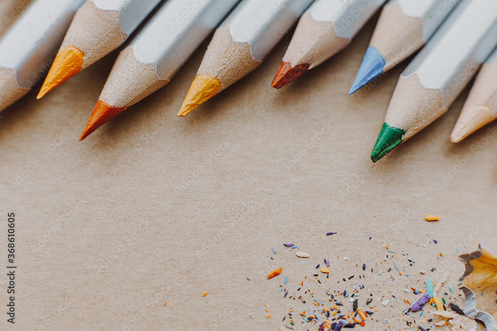 preparation of colored pencils for drawing, sharpened pencils and shavings, creative background for work in the artist