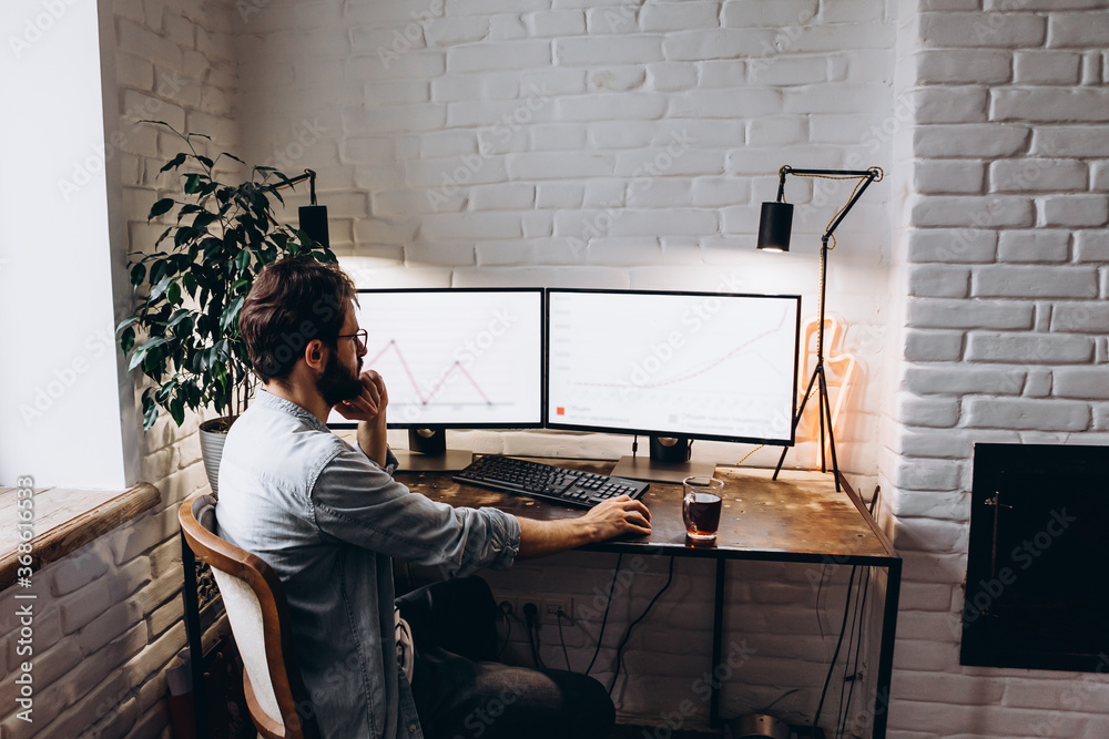 adult bearded man working sitting at home desk at computer. Self-isolation during quarantine, work at home, copy space