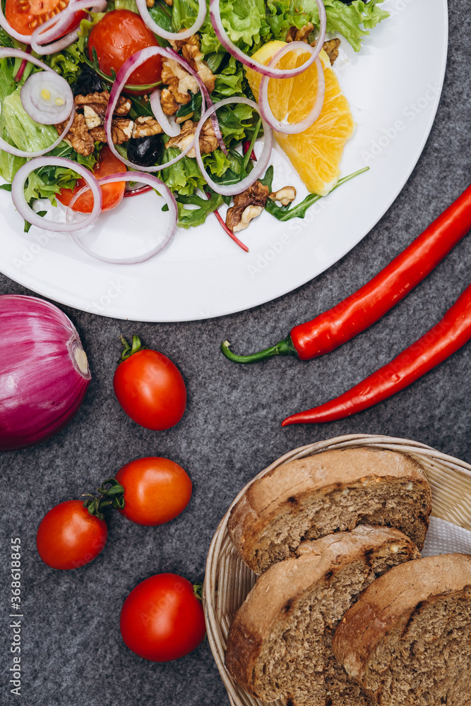plate of fresh salads and mouth-watering ingredients for cooking, chili peppers, mini-tomatoes, grilled bread, blue onion