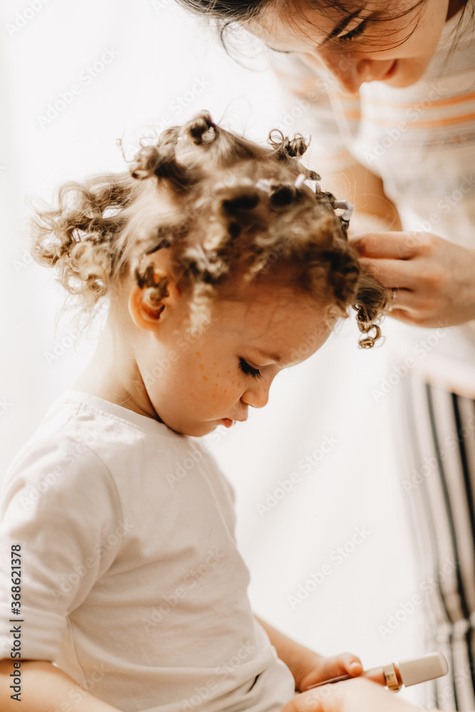 parents unwrap the baby's hair, which they tried to make curly with the help of homemade curlers Home family fun parents with baby.