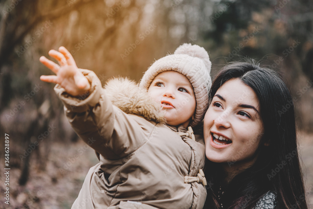portrait of young beautiful mother and her cute little daughter walking on a cool autumn day in the park