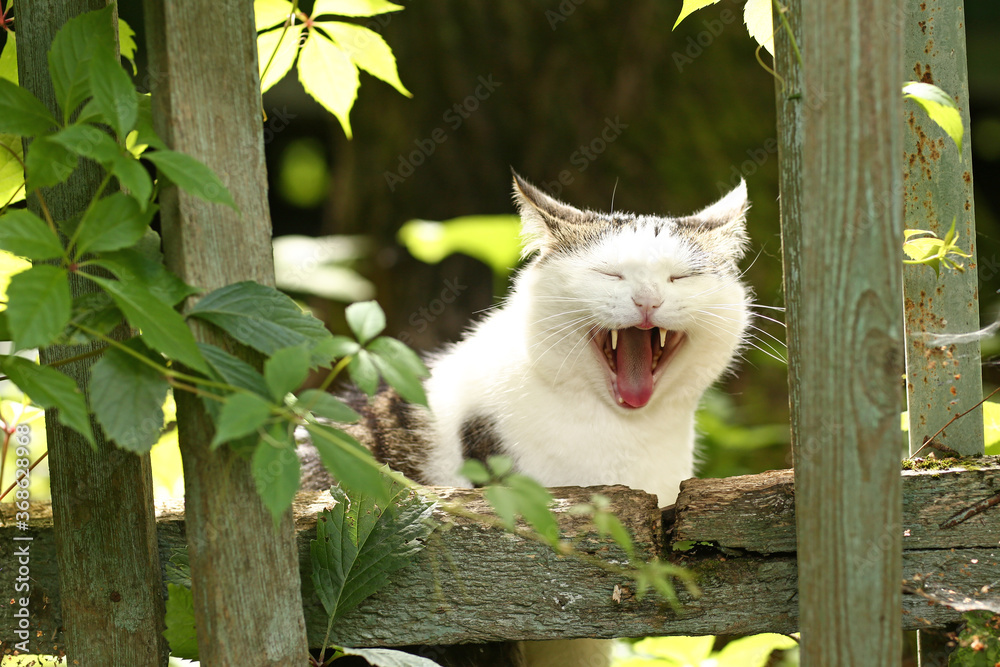 country funny cat yawning outdoor closeup photo relaxing on patchwork pillow