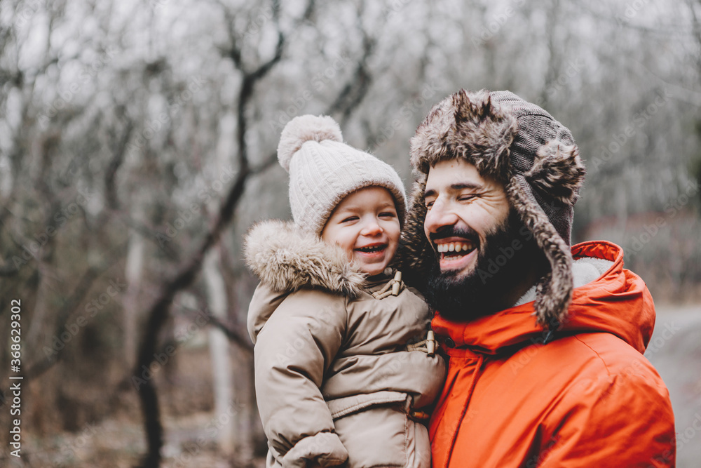 Handsome young dad and his little sweet daughter have fun outdoors in winter. Happy family spending time together. Family concept.