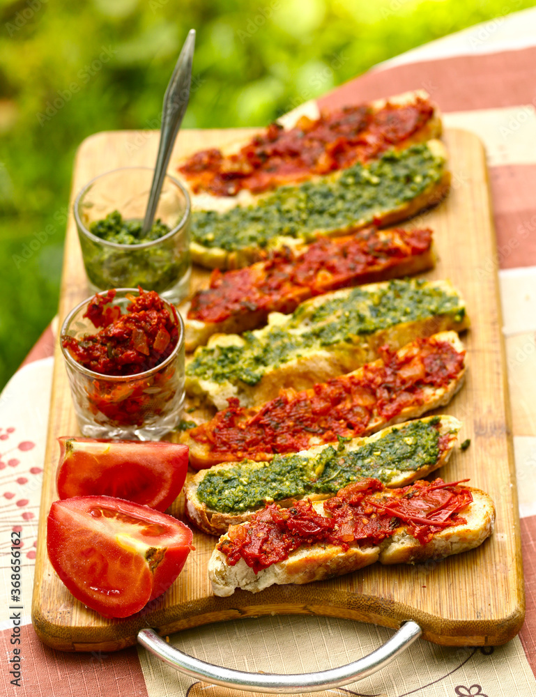hot chili tomato and pesto sauce, sliced roasted italian ciabatta bread for cooking bruschetta sandwiches