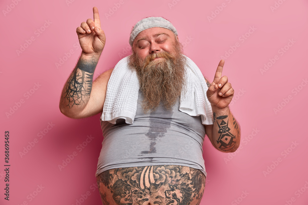 Obesity and sport concept. Joyful overweight man dances carefree has sweaty body tattooed arms points upwards isolated on pink background, does exercises at home, burns calories after eating fast food