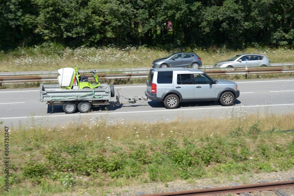 Voiture tractant une remorque avec une tondeuse sur une voie express
