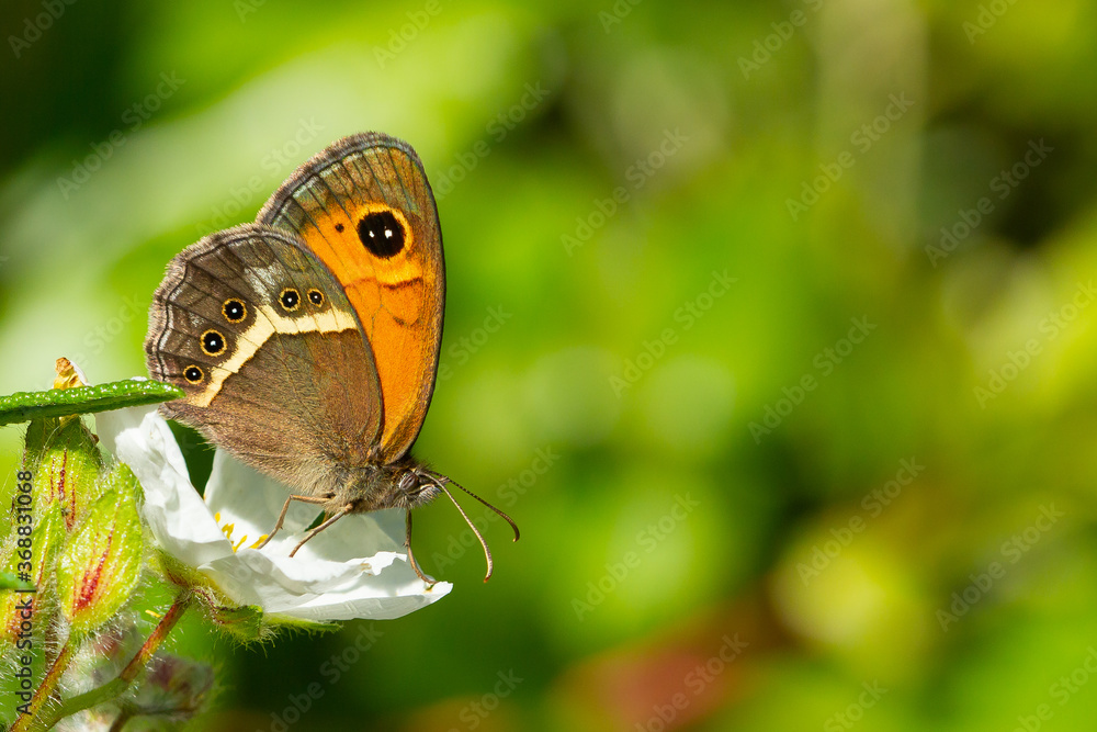 Pyronia bathseba, the Spanish gatekeeper, orange butterfly on white flower with green background.