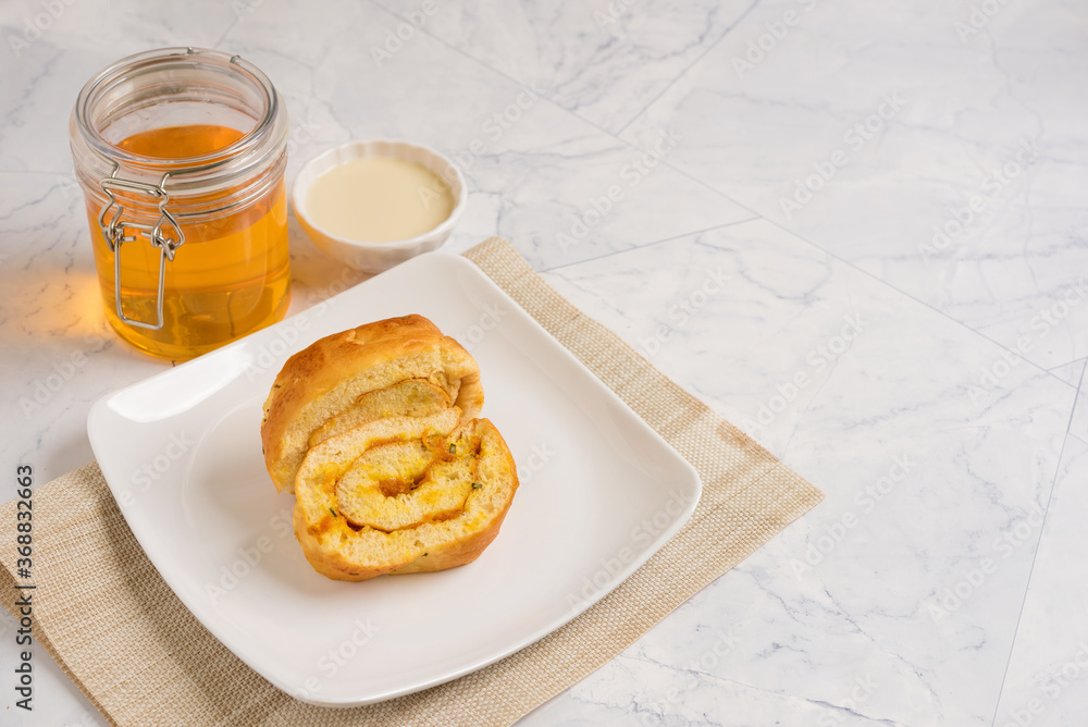 The yellow bread is laid on a white plate and there is tea in the glass on the marble table.