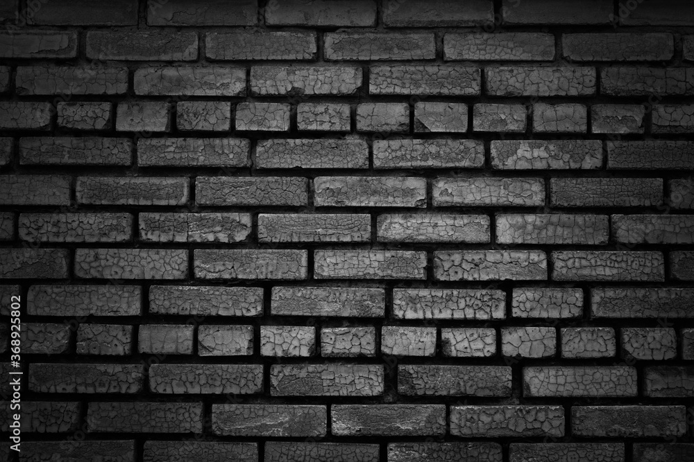 Black brick wall texture background. Black white grunge background. Old brick wall with cracks.