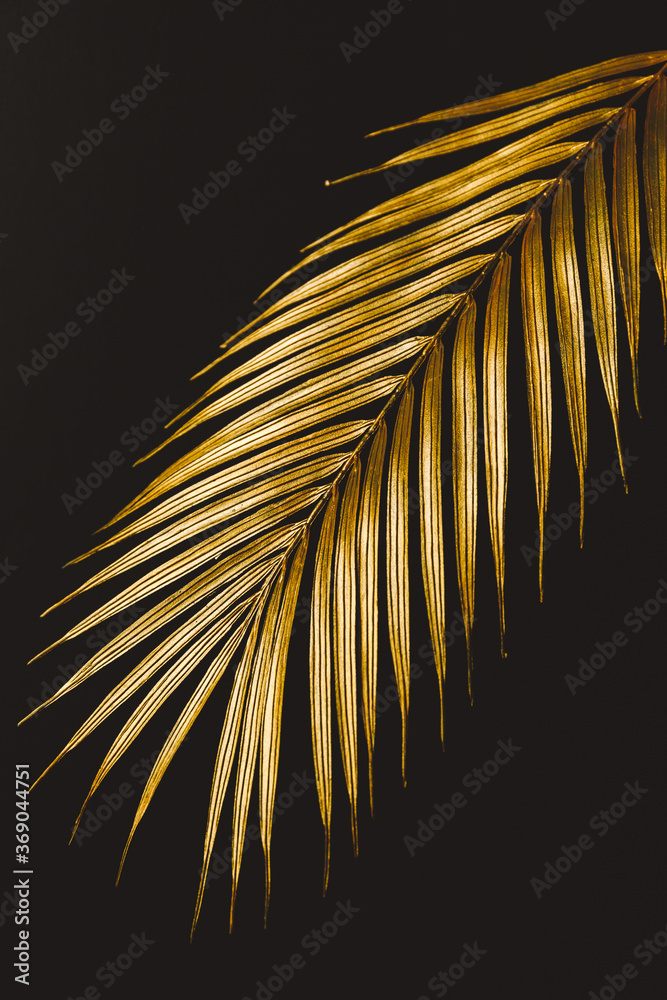 Dark and rich tropic minimalist creative photography of a golden palm leaf over a black canvas.