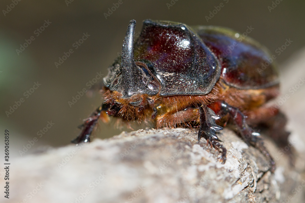 Escarabajo rinoceronte (Oryctes nasicornis) sobre el tronco con fondo gris.