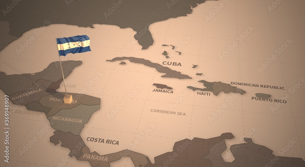 Flag on the map of honduras. Vintage Map and Flag of Central America, Caribbean Countries Series 3D Rendering