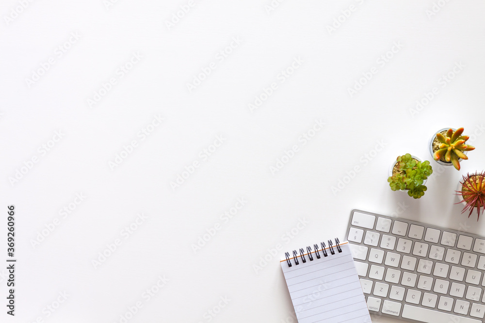 White desk at home seen from above. Keyboard, notebook and succulents. Office space. Home office. Copy space.