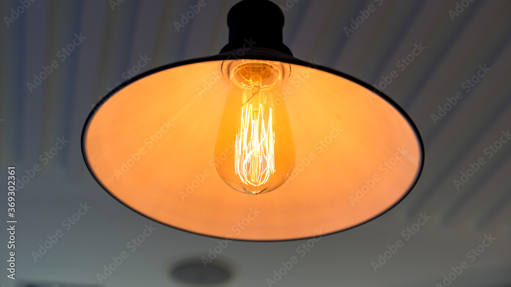 Closeup of light bulb on the wall, turned on lamp on the ceiling, idea concept, power and electricity, save the energy and turn off the lights