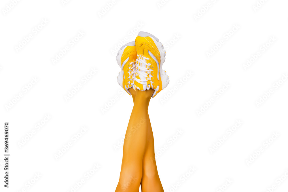 Yellow female sneakers on long slender woman legs