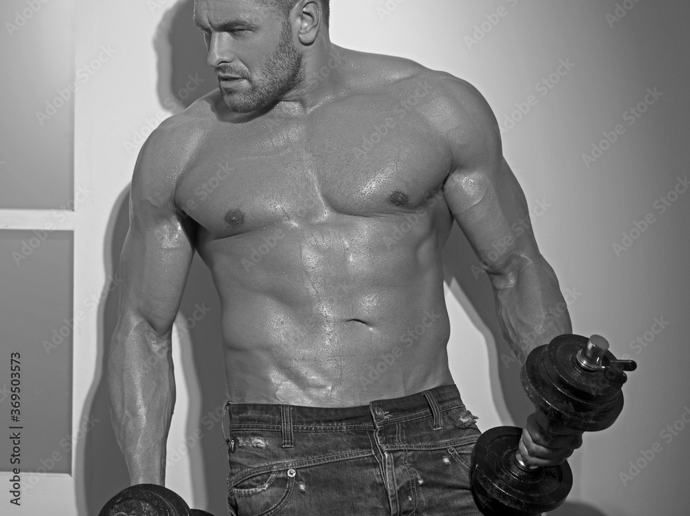 Sporty muscular guy with dumbbells. Sport and fitness motivation. Individual sports recreation.