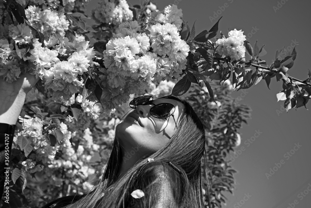 Portrait of young lovely woman in spring flowers.