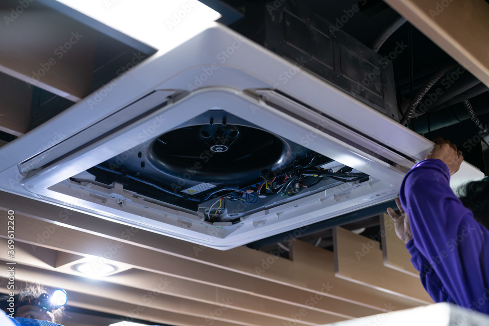 Worker repairing a ceiling air conditioning unit (Cleaning air-conditioner)