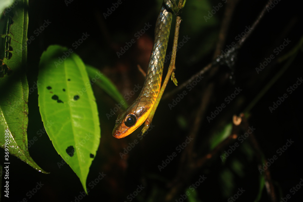 A snake of the racer family, chironius with a dark brown greenish coloration and a yellow belly sliding down a small branch with a black background
