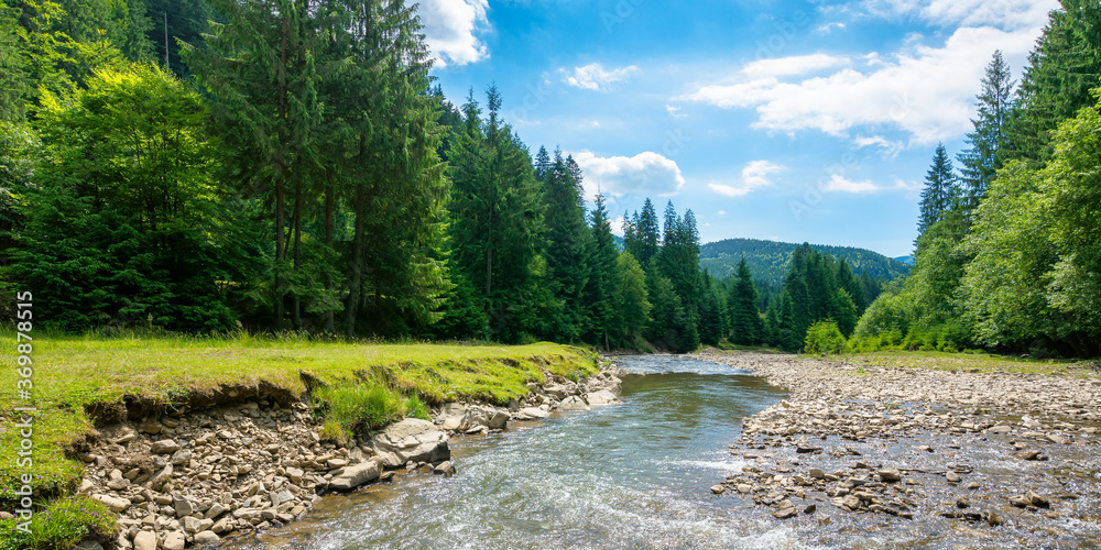 mountain river among the forest in valley. sunny summer landscape. green grass and rocks on the shore. white clouds on the blue sky