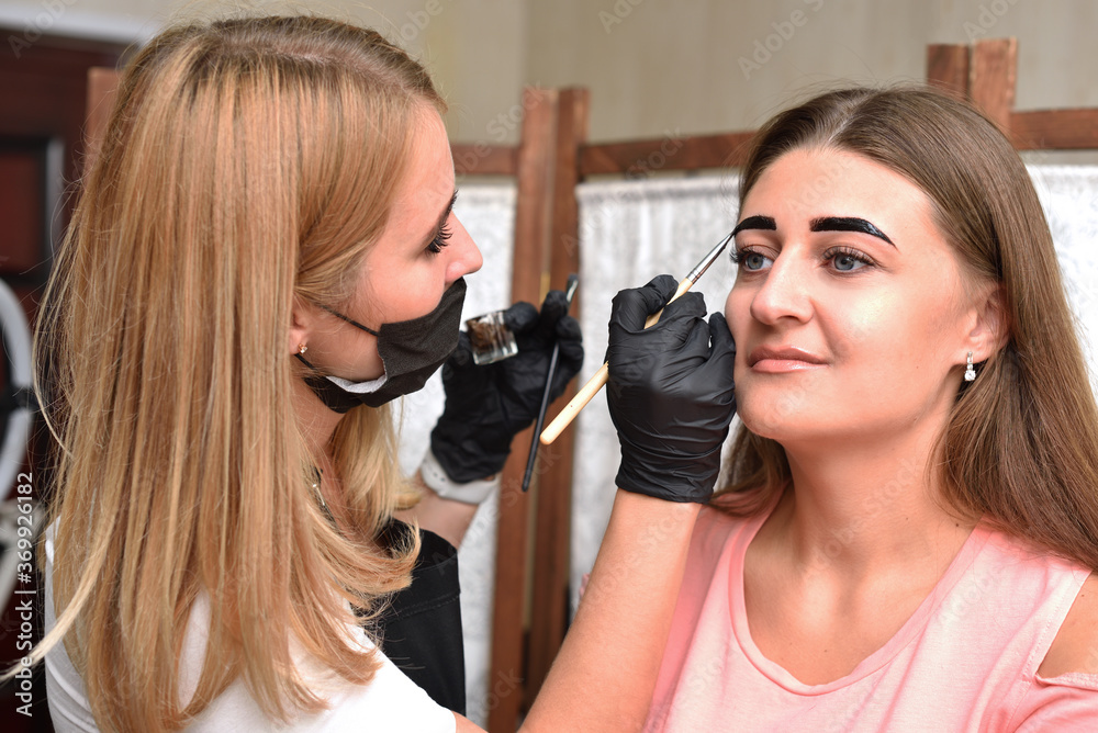 Beautician makes eyebrow coloring with henna to a young woman in a beauty salon