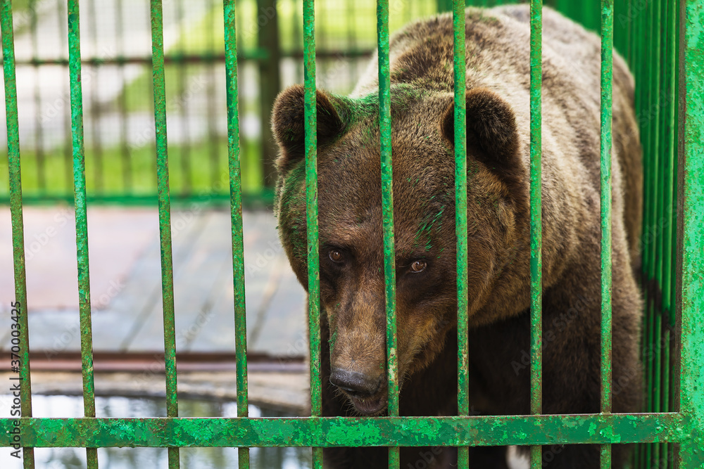 Bear in a cage with a painted face. Concept on the topic of abuse of animals
