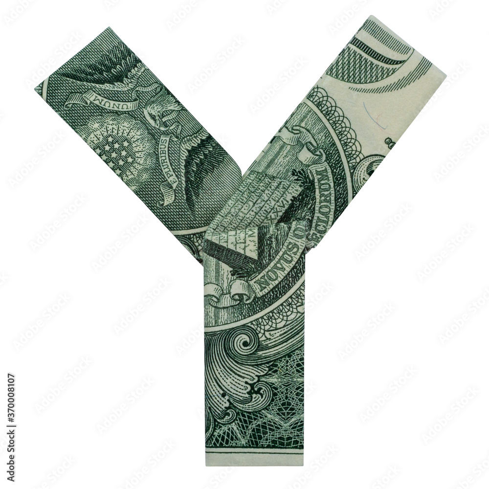 Money Origami LETTER Y Character Folded with Real One Dollar Bill Isolated on White Background