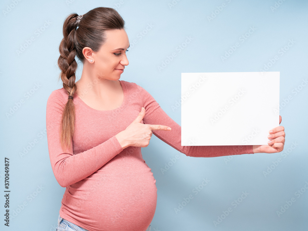 Young beautiful pregnant woman over isolated blue background holding a blank sheet of paper. Lifestyle Concept, your text here. Copy space