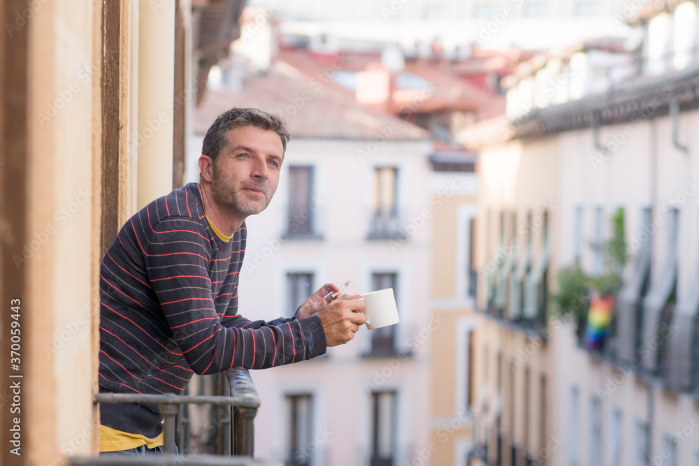 30s or 40s attractive and happy man at home balcony relaxed and cheerful enjoying cup of coffee smoking cigarette looking to city street smiling and enjoying the urban view